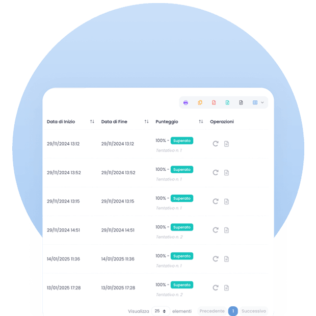 Programma test automatici a conclusione del corso, definisci un tempo di compilazione e un numero massimo di tentativi e e monitora i progressi attraverso i report.